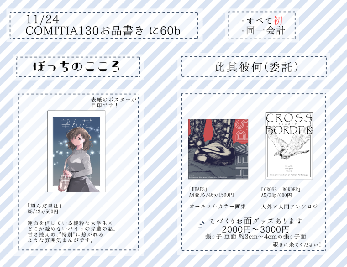 11/24、コミティア130は「に60b」でお待ちしております。